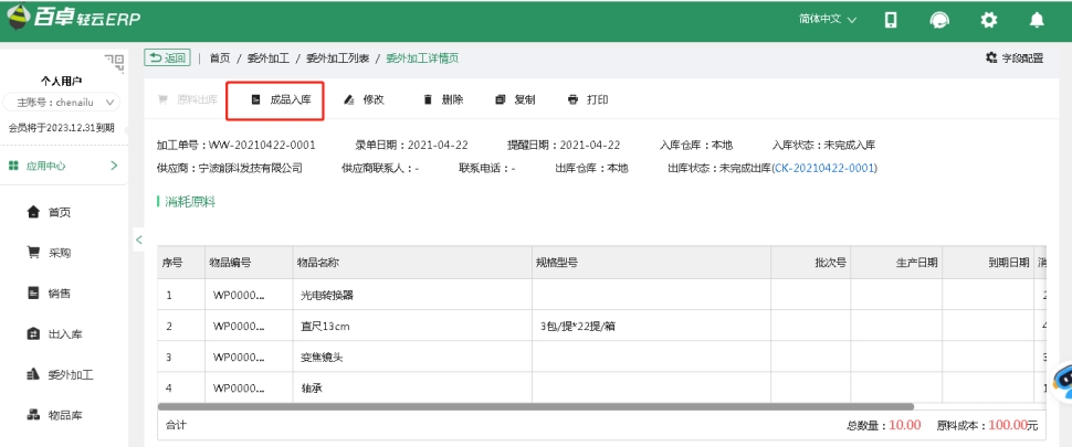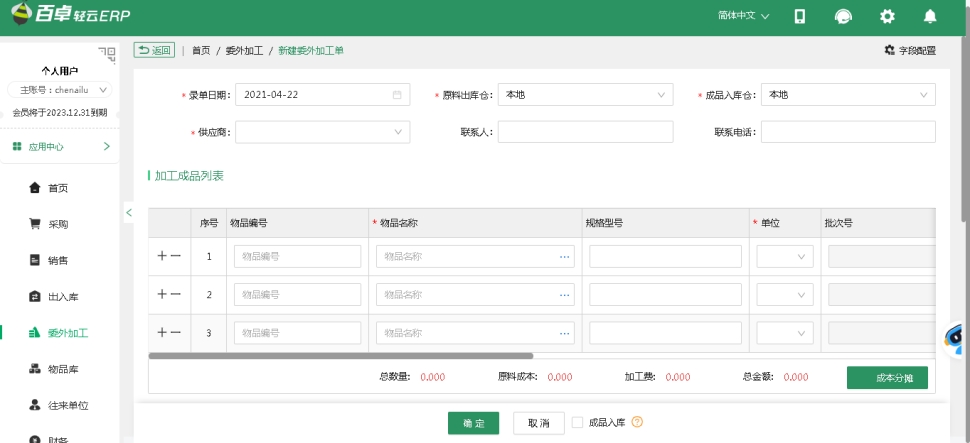 在需要進(jìn)行生產(chǎn)時(shí),創(chuàng)建委外加工單,單據(jù)內(nèi)會(huì)記錄委外加工時(shí)需要消耗的原材料及數(shù)量成本、生產(chǎn)出的成品及數(shù)量、加工費(fèi)用,最終成品單位成本。