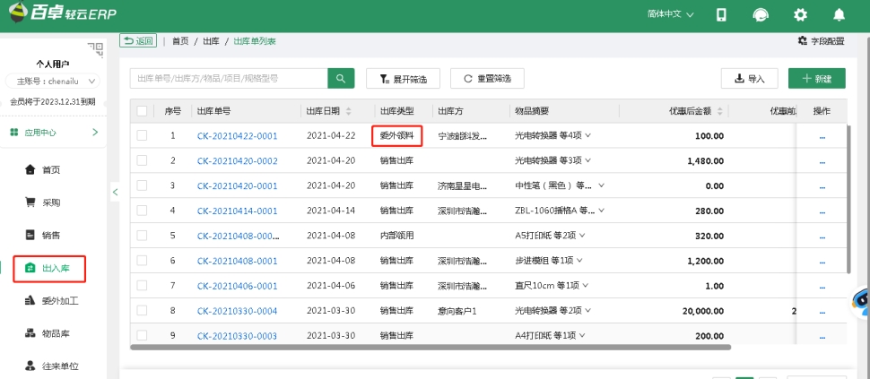 保存加工單后,將會(huì)生成一條委外領(lǐng)料出庫(kù)單,實(shí)現(xiàn)原材料的出庫(kù)。